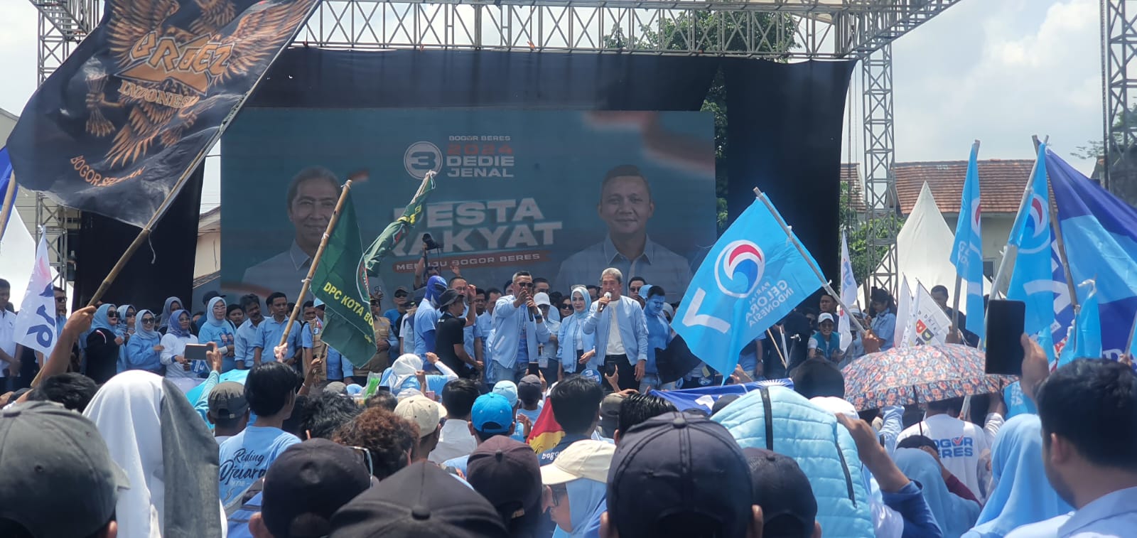 Usai orasi, calon Wali Kota Dedie A Rachim mengucapkan terima kasih kepada seluruh kader, simpatisan, serta ribuan elemen masyarakat yang hadir untuk meramaikan *Pesta Rakyat Bogor Beres*.